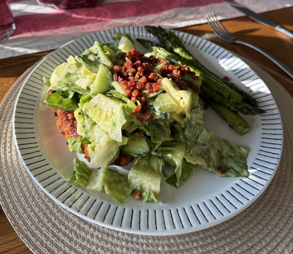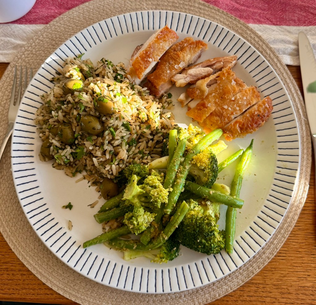 - Crispy chicken thighs — My go-to comfort dish: golden skin, olive rice, pesto greens. Simple, flavourful, perfect.